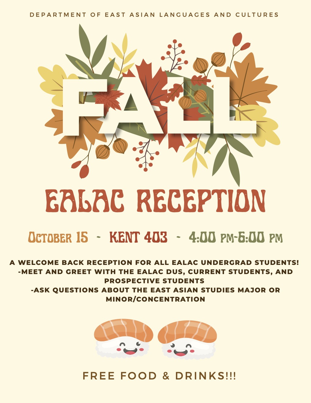 Join us for the EALAC Fall Open House on October 15th! Take a study break, enjoy some food, and connect with fellow students and faculty. Hope to see you there!