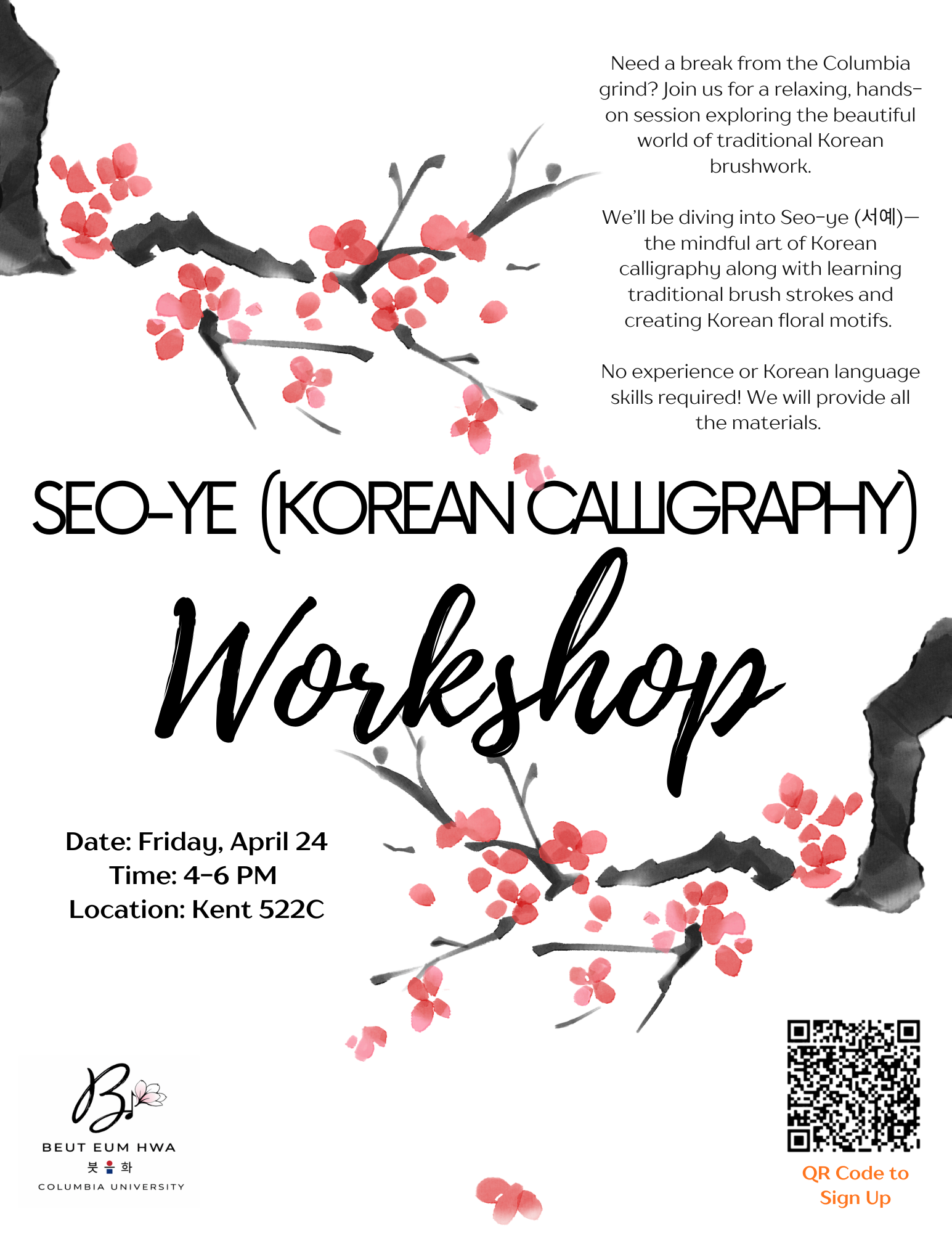 Join Beut Eum Hwa for their Seo-ye (Korean calligraphy) workshop! No experience or Korean language skills required, and al materials will be provided.