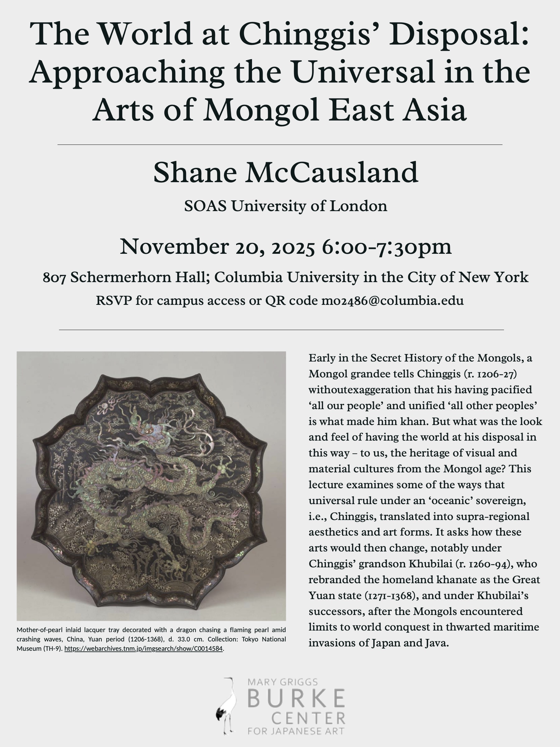 Early in the Secret History of the Mongols, a Mongol grandee tells Chinggis (r. 1206-27) withoutexaggeration that his having pacified ‘all our people’ and unified ‘all other peoples’ is what made him khan. But what was the look and feel of having the world at his disposal in this way – to us, the heritage of visual and material cultures from the Mongol age? This lecture examines some of the ways that universal rule under an ‘oceanic’ sovereign, i.e., Chinggis, translated into supra-regional aesthetics and art forms. It asks how these arts would then change, notably under Chinggis’ grandson Khubilai (r. 1260-94), who rebranded the homeland khanate as the Great Yuan state (1271-1368), and under Khubilai’s successors, after the Mongols encountered limits to world conquest in thwarted maritime invasions of Japan and Java.