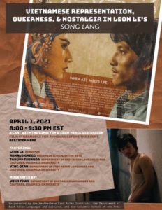 Special zoom event featuring award-winning Vietnamese-American director Leon Le, entitled Vietnamese Representation, Queerness, and Nostalgia in Leon Le's Song Lang. On Thursday April 1st, from 8-9:30pm EST Leon will join top Columbia film scholars Ronald Gregg (School of the Arts), Takuya Tsunoda (EALAC) and Ying Qian (EALAC) to discuss queer Vietnamese representation in film, with […]