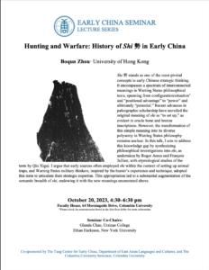 Speaker: Boqun Zhou, University of Hong Kong Time: October 20, 2023 (4:30-6:30 PM EST) Venue: Faculty House *Please check the announcement board in the first floor lobby for room information. Shi 勢 stands as one of the most pivotal concepts in early Chinese strategic thinking. It encompasses a spectrum of interconnected meanings in Warring States philosophical texts, spanning from configuration/situation” and “positional advantage” to “power” and ultimately “potential.” Recent advances in paleographic scholarship have unveiled the original meaning of shi as “to set…