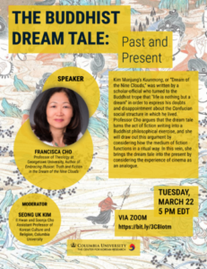 Francisca Cho, Professor, Department of East Asian Languages and Cultures, Georgetown University Moderated by Seong Uk Kim, Il Hwan and Soonja Cho Assistant Professor of Korean Culture and Religion, Columbia University Tuesday, March 22, 2022 5:00 PM ET Registration required Co-sponsored by the Center for Korean Research and Weatherhead East Asian Institute Abstract: Kim Manjung’s Kuunmong, or Dream of the Nine Clouds, was written by a scholar-official and he turned to the Buddhist trope that “life is nothing but a dream” in order…