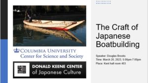 The Center for Science and Society, the Donald Keene Center, and the History department kindly invite you to join us on the evening of March 20, 2023 from 5:00-7:00 PM in Kent 403 for a lecture and Q&A with Douglas Brooks, a master craftsperson, who has spent the past 30 years studying, recording, and teaching the craft of Japanese boat building. His work, and that of his students, is on display at museums and libraries around the country. For further details about the event…