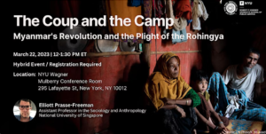 Wed, March 22, 2023 12:00 PM – 1:30 PM NYU Wagner 295 Lafayette Street Mulberry Conference Room New York, NY 10012   Registration Information: To attend the event in person, please register here. To attend the event online, please register here.   NOTE: This event will be in person and online. Event Information:  In this talk, Prasse-Freeman discusses his ongoing fieldwork from Cox's Bazar refugee camps and the Thai/Burma border, exploring the effects of the ongoing revolution on the enduring issue of…