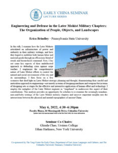 Speaker: Erica Brindley, Pennsylvania State University Time: May 6, 2022 (4:30-6:30 PM EST) Venue: Faculty House *Please check the announcement board in the first floor lobby for room information. **Please see Seminar Safety Guidelines for attendance information. In this talk, I examine how the Later Mohists articulated an infrastructure of power and authority in their military writings, and how they hoped to mobilize both human labor and material goods through an efficacious blend of rituals and hierarchical command. First, I lay out…
